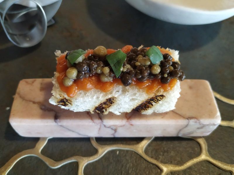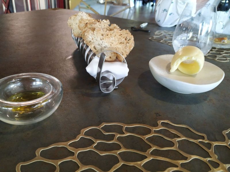 Aunque ya llevábamos cerca de dos horas en el restaurante, es en este momento cuando comienza el menú. Mantequilla AOC Charentais-Poitou, con pan de semillas. AOVE Ecológico Cabaña, elaborado a partir de los propios olivos de la Finca Buenavista, con pan de aceitunas. Y para completar un paté de hueva de mújol, con baja curación, acompañado de pan de almendras.
