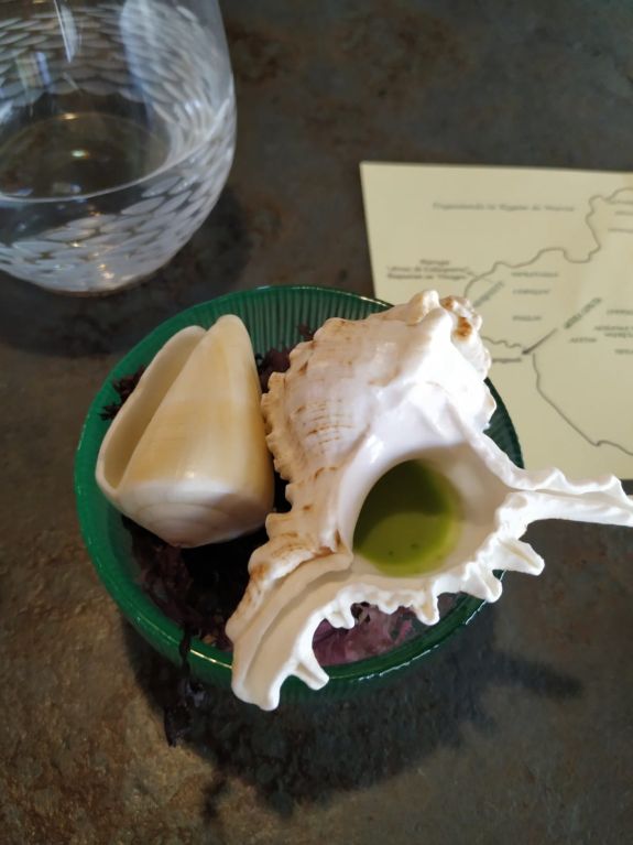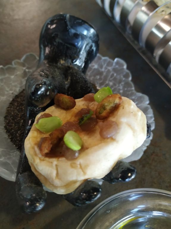 El siguiente plato principal fue un taco de merluza negra, patatas ahumadas y emulsiones cítrico-herbáceas. Las salsas se presentan en sendas caracolas, con la indicación de verterlas juntas sobre la merluza, y una focaccia de calamar y manzanilla.