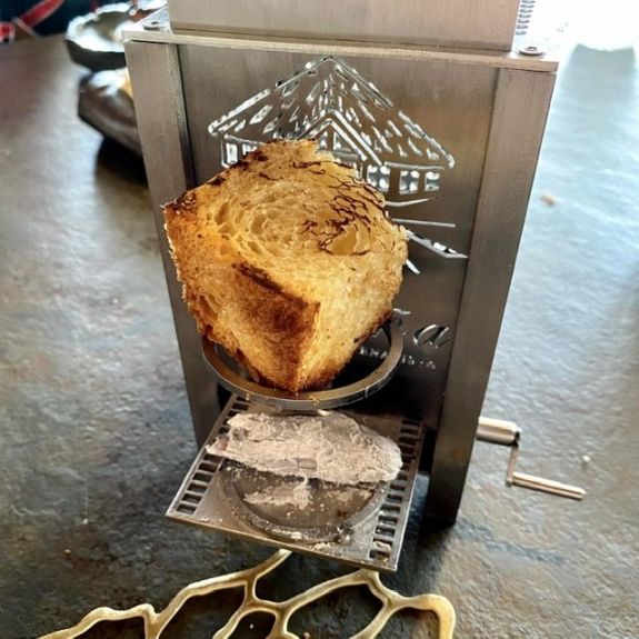 El último de los platos principales es el lomo de corzo, mini calabacín al enebro y queso al momento, acompañado de un pan de masa croissant calentito para rebañar y crujiente de zanahoria. El queso había sido elaborado ante nosotros mientras degustábamos algunos de los platos del menú, siguiendo todos los pasos necesarios para hacerlo.