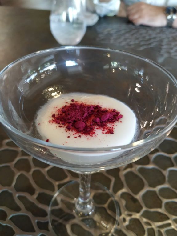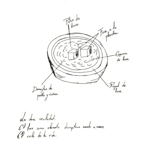 Seguimos caminando por el jardín hasta llegar a la estación dedicada a Juan Gil de Biedma. Allí probamos un aperitivo en el que, ahora, el foie era la estrella. Foie a la planta, espuma de foie, royal de foie, polvo de foie y un demiglas de pollo y coñac.
