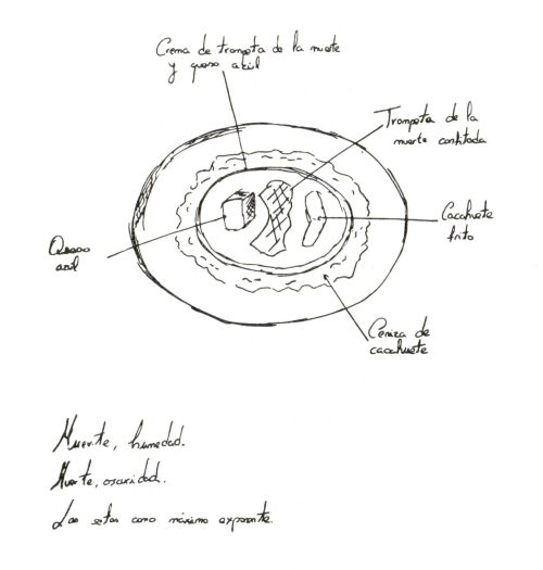 Finalizamos nuestro paseo por el jardín con Vicente Aleixandre. Crema de trompeta de la muerte y queso azul, junto al queso azul y la trompeta de la muerte confitada. Cacahuete frito y crema de cacahuete.