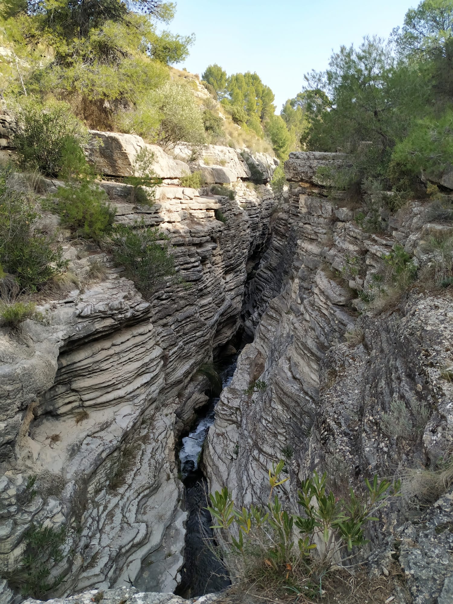 A partir de este punto el río Moratalla avanza más encajado que nunca entre las rocas, formando un estrecho y hondo desfiladero o cañón, que muestra la asombrosa fuerza erosiva del río. La belleza de esta garganta de paredes oscuras es el resultado visible de la constante y larga lucha entre el agua y la roca.