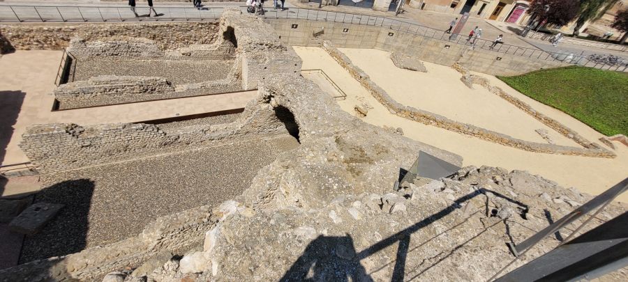 De camino pasamos la Plaça del Pallol, un recinto de forma rectangular de gran tamaño que se encuentra rodeado por pórticos en tres de sus lados. Sus ruinas se declararon en 1931 como Zona Arqueológica, pues se corresponden con la zona occidental del Fórum Provincial, construido en el siglo I d.C. La plaza del Pallol era parte de la galería intermedia.