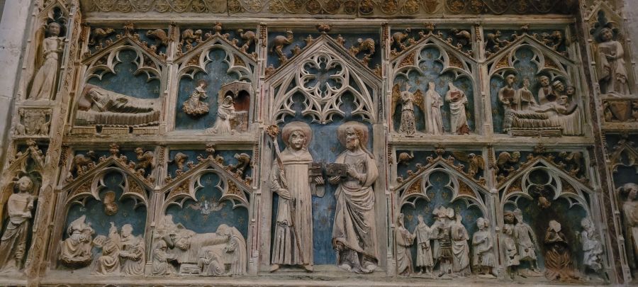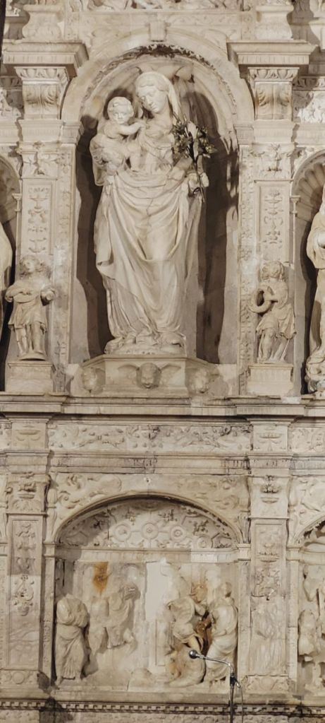 El retablo que hay entre ellos en la capilla mayor, de 1529 (durante el reinado de Carlos I) es también de alabastro, y este es también una fiel reconstrucción del original. En el centro se encuentra la imagen de la Virgen María y se pueden contemplar escenas de la vida de Jesús, santos, apóstoles y arriba del todo la Crucifixión.