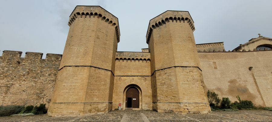 A su izquierda, la Puerta Real permite el acceso al Monasterio de Poblet, y parte de las murallas que lo rodean, que miden un total de 608 metros de largo, 11,3 metros de altura y 2 de grosor. Tiene 12 torres y camino de ronda.