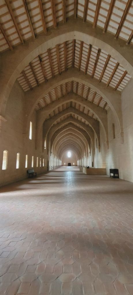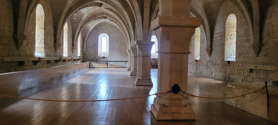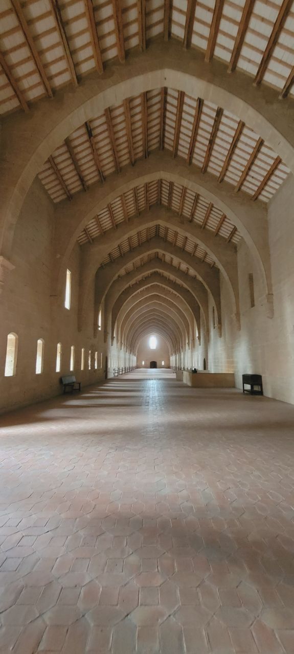 Unas escaleras conducen al piso superior, en el que podemos ver el dormitorio. Esta enorme nave de finales del siglo XIII, mide 87 metros de longitud y 10 de anchura. Tiene diecinueve arcos de diafragma que salen de ménsulas y que sujetan el tejado de madera, y una doble fila de ventanales da mucha luz al lugar.