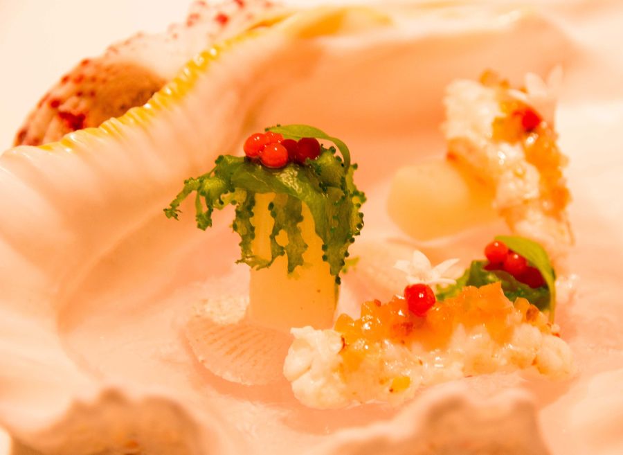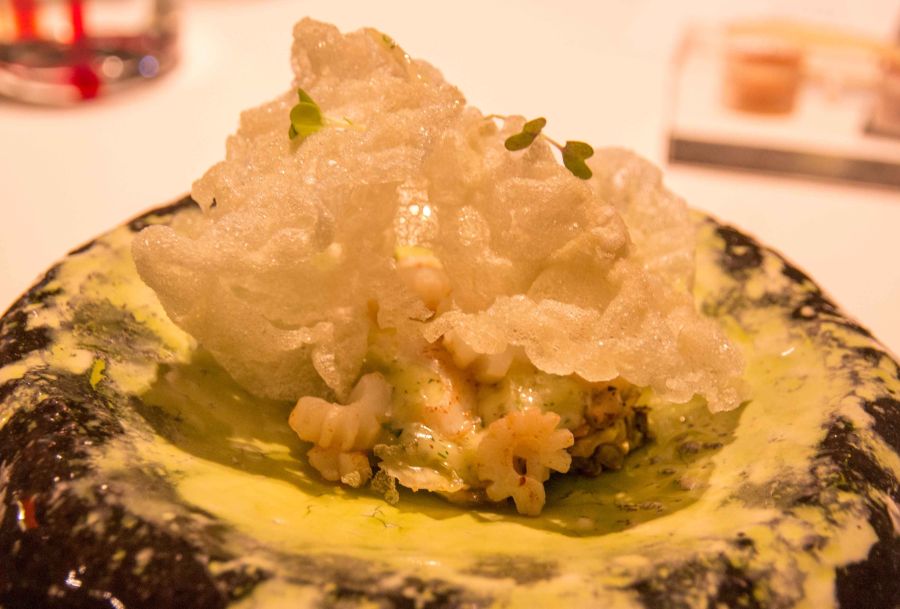 Cigalas al Vapor de Tosaka Verde. Bocado de mar respetando el sabor del producto. Interesante la combinación con las algas y las perlas rojas cítricas que explotaban en boca.