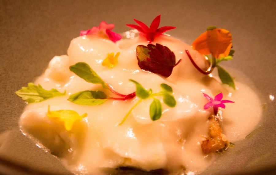Merluza con Pilpil de Gambas. La merluza estaba de escándalo, meloso pilpil de gambas y un sabor delicado y delicioso. Los piñones aportan el crujiente y las flores son notas de color que de nuevo nos transmiten personalidad y dan toques de sabor floral al plato.