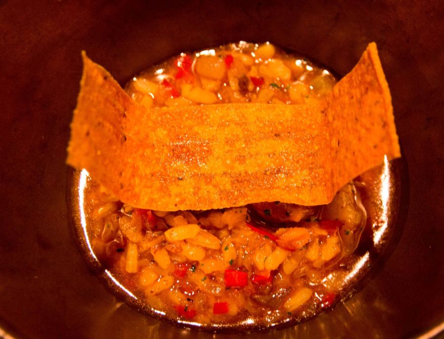 Arroz con Pichón. Un plato lleno de sabor. El crujiente de aceituna negra destaca y aporta personalidad al plato.
