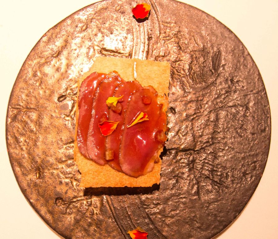 Magret de Pato. Un plato redondo, carpaccio de magret de pato combinado con foie y confitura de naranja amarga, equilibrio perfecto entre lo graso y lo cítrico.