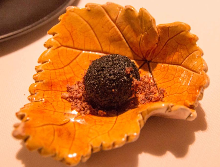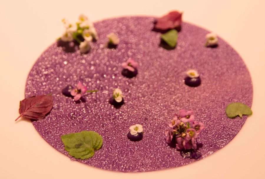 Parmentier de Patata Morada. Destacar el sabor sutil de la trufa y del aceite. El crujiente que corona el plato es un jardín en la boca.