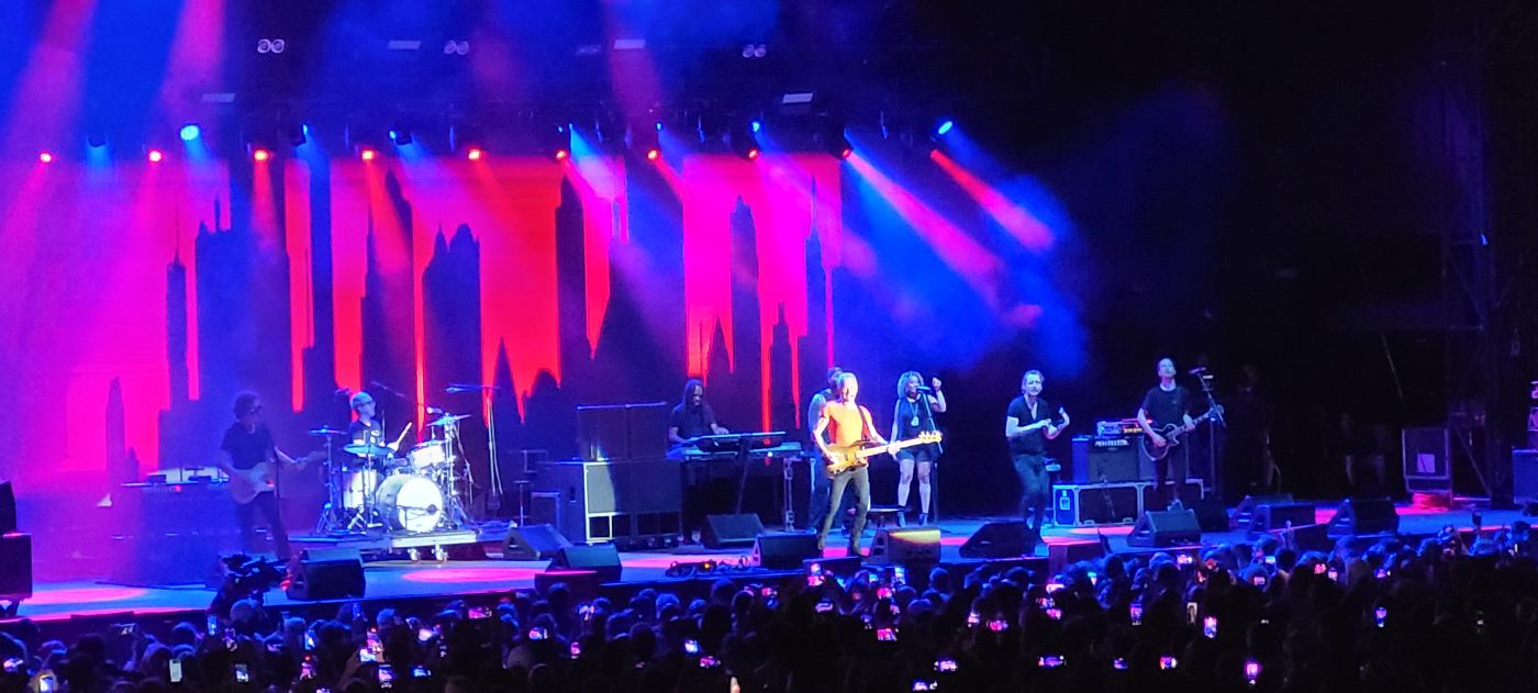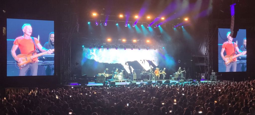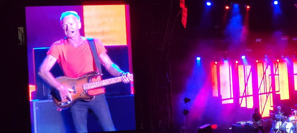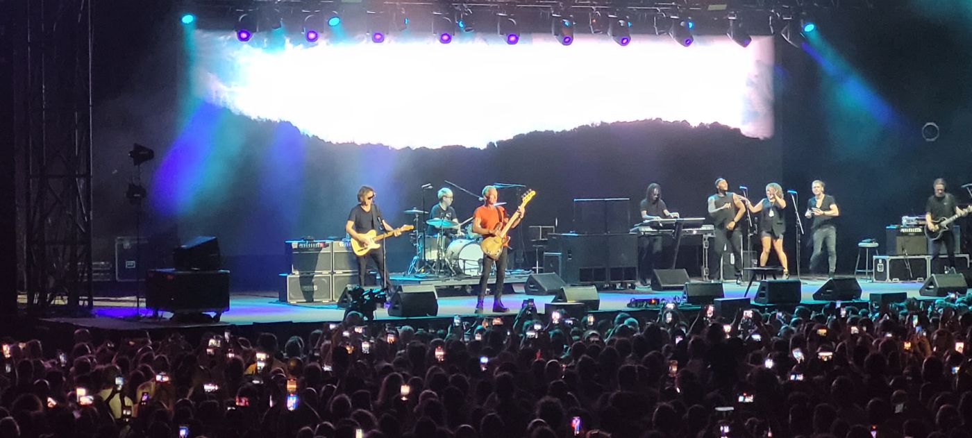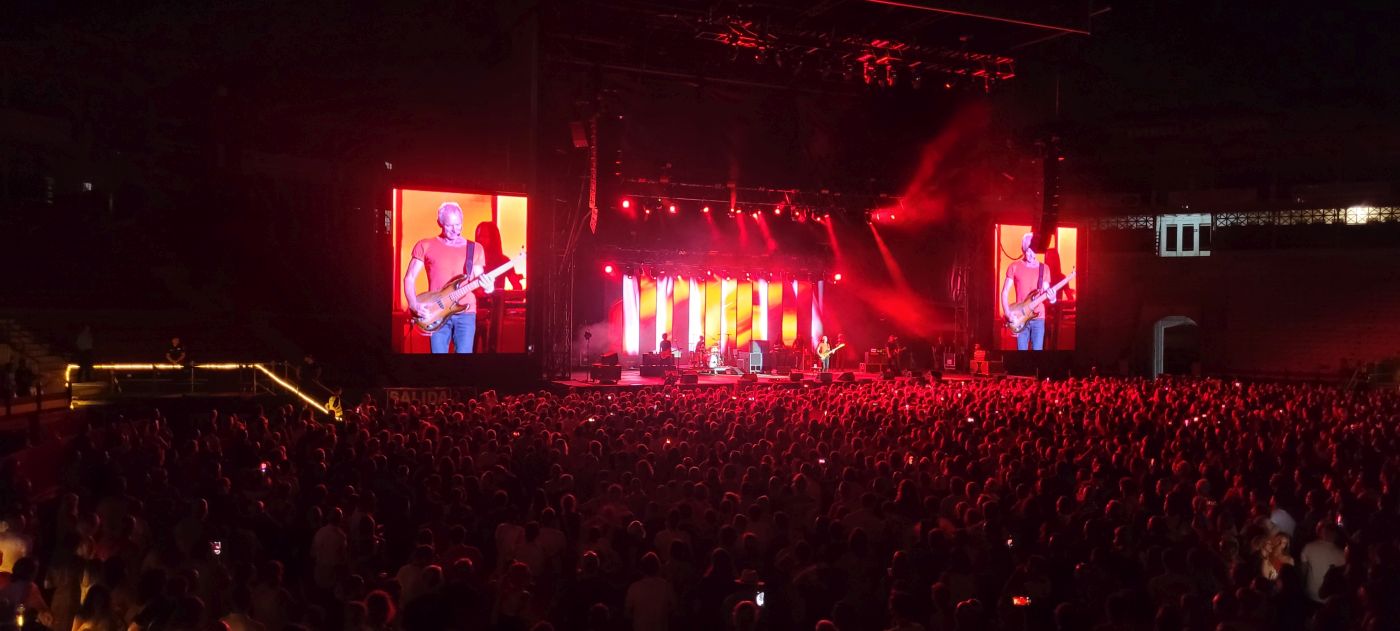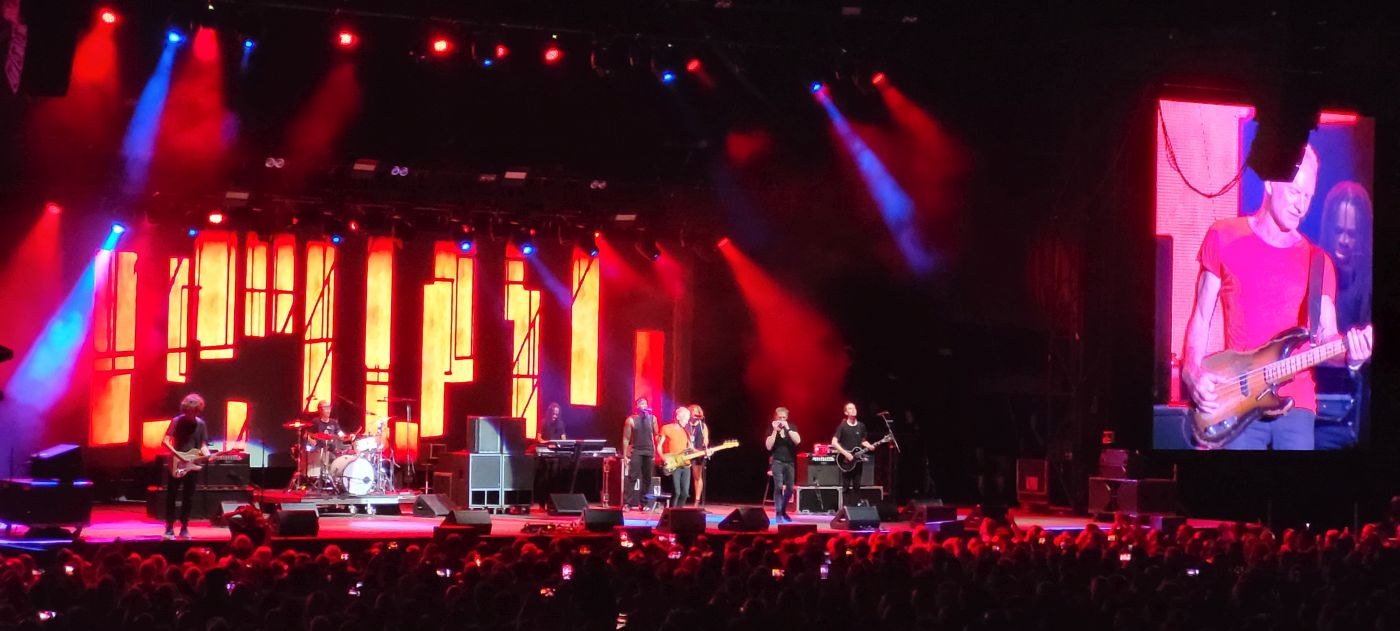 Comenzó el concierto, para deleite de los asistentes, con una entusiasta versión de “Message in a bottle”, a la que seguirían a lo largo del concierto “Every little thing she does is magic”, “Walking on the moon”, “So Lonely”, “King of pain”, “Every breath you take”, y “Roxanne”, que levantaron a los asistentes de sus asientos, los que estaban sentados en las andanadas de la plaza, más los que arrebataban la arena, a reventar.