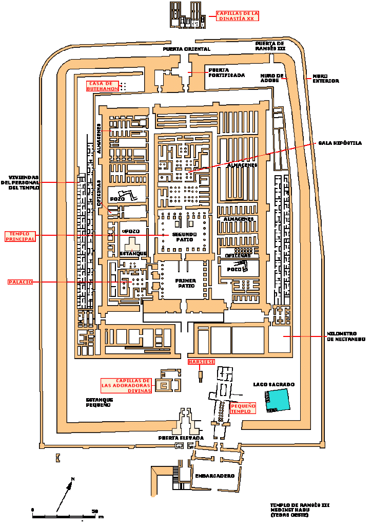 El complejo de Medinet Habu se convirtió en un importante foco administrativo, incluso tras la muerte del rey. El complejo templario contaba con jardines, talleres, estanques, oficinas, almacenes y viviendas para los sacerdotes. Estaba conectado al río mediante un embarcadero y, además, posee un lago sagrado y un nilómetro, y en su interior contaba con su propio tribunal y cuerpo de policía.