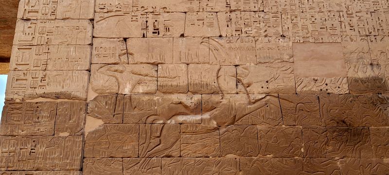 La decoración exterior del templo muestra a Ramsés III en escenas militares, escenas de caza, expediciones, etc., así como un calendario con las festividades religiosas.