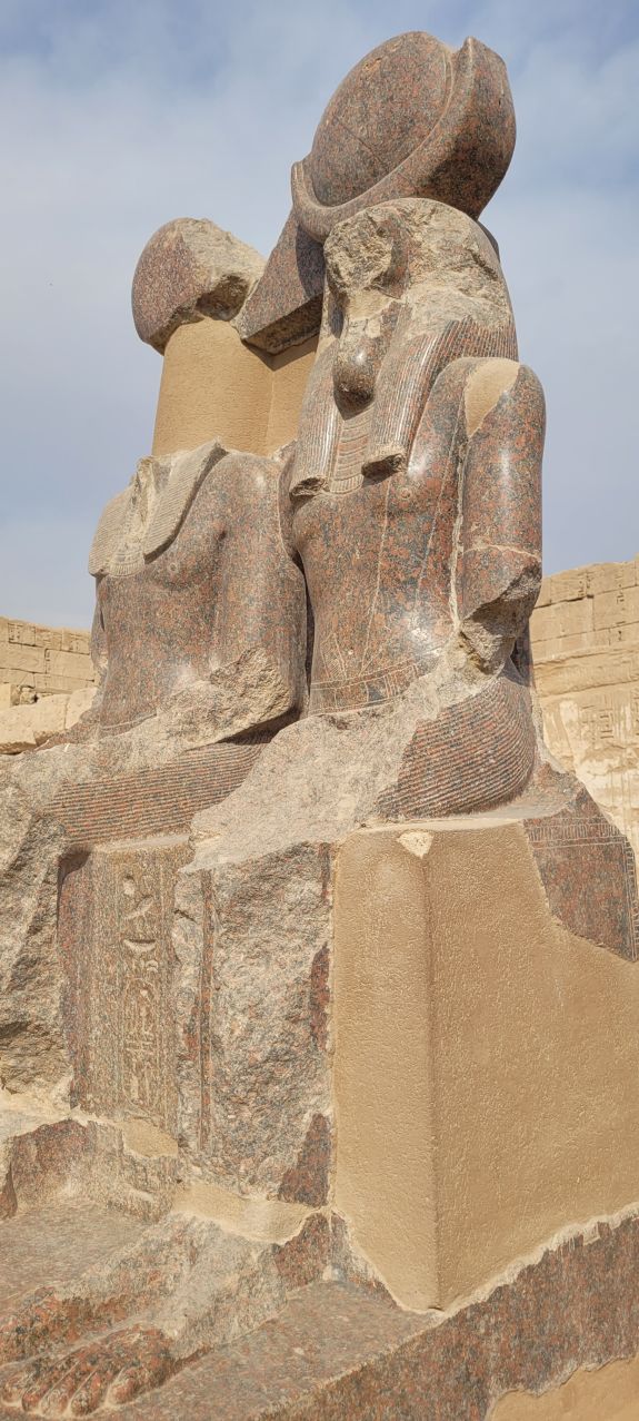 El trono muestra grabados e imágenes simbólicas de su madre, esposa y dios Hapi. Los arquitectos construyeron estas estatuas para salvaguardar el templo mortuorio del rey. Sin embargo, hoy muy poco del templo mortuorio permanece, aparte de los Colosos de Memnon.