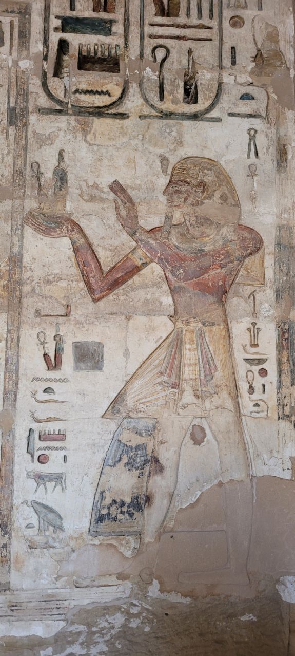 En la decoración de la entrada vemos al rey aplastando a los enemigos de Egipto, así como al dios Ptah, quien tendría el papel de intermediario entre los fieles que no podían acceder al templo, este dios “escucharía” sus plegarias y se las trasladaría a Amón.