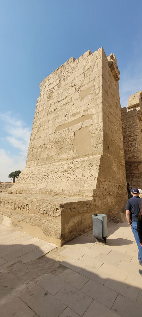 Cruzando el primer patio llegamos al segundo pilono del templo, más pequeño que el anterior, que cuenta con 16 m de altura. Antiguamente nos habríamos encontrado con dos colosos del monarca a ambos lados de la puerta de este pilono. La decoración elegida en esta ocasión muestra una presentación de cautivos a los dioses Amón y Mut.