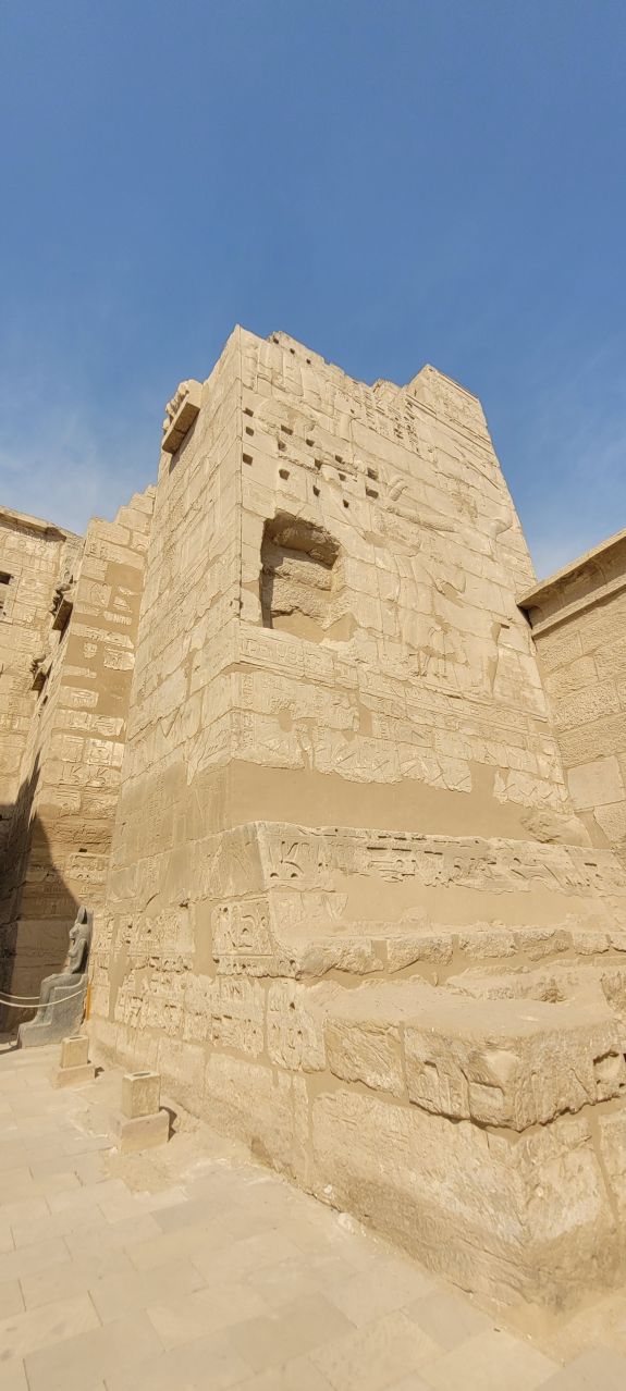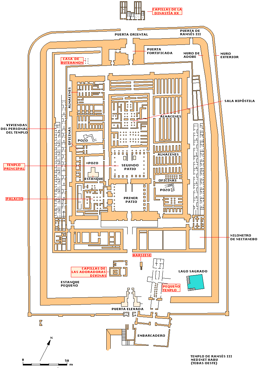 Varios son los espacios que configuran el templo funerario de Ramsés III. El primer pilono tiene unas dimensiones de 24 m de altura y 63 de ancho. En él vemos representado a Ramsés III derrotando a los libios y a los “pueblos del mar”, quienes atacaron Egipto durante su reinado. Presenciando y acompañando al rey en estas escenas de batalla encontramos a los dioses Ra-Horakhty y Amón.