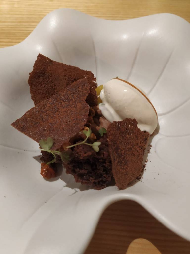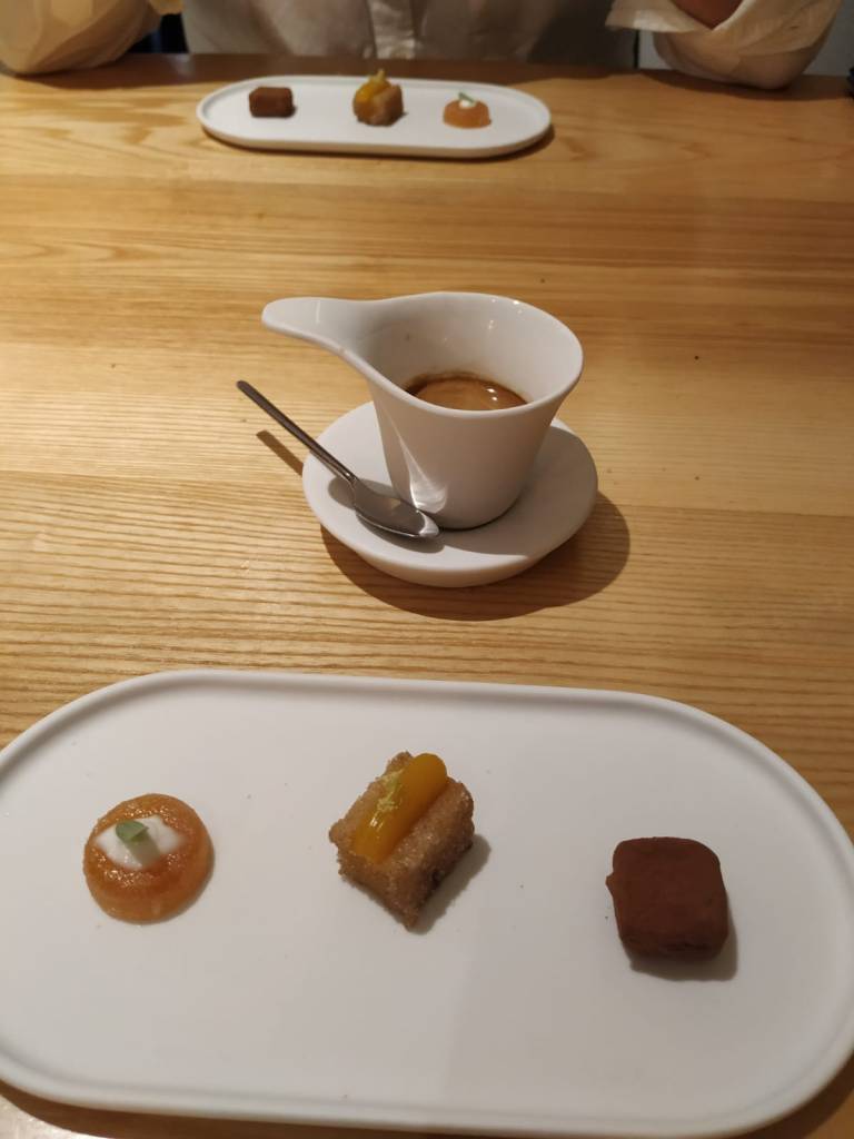 Para finalizar, los Dulces. Un prepostre de Limón, merengue y hierbabuena y un postre propiamente dicho, Chocolate, torta de “recao” y toffee salado, acompañados de los ya típicos “petit fours” de Albaricoque, matasuegras y asiático.