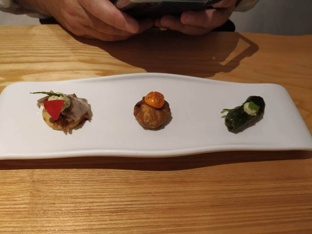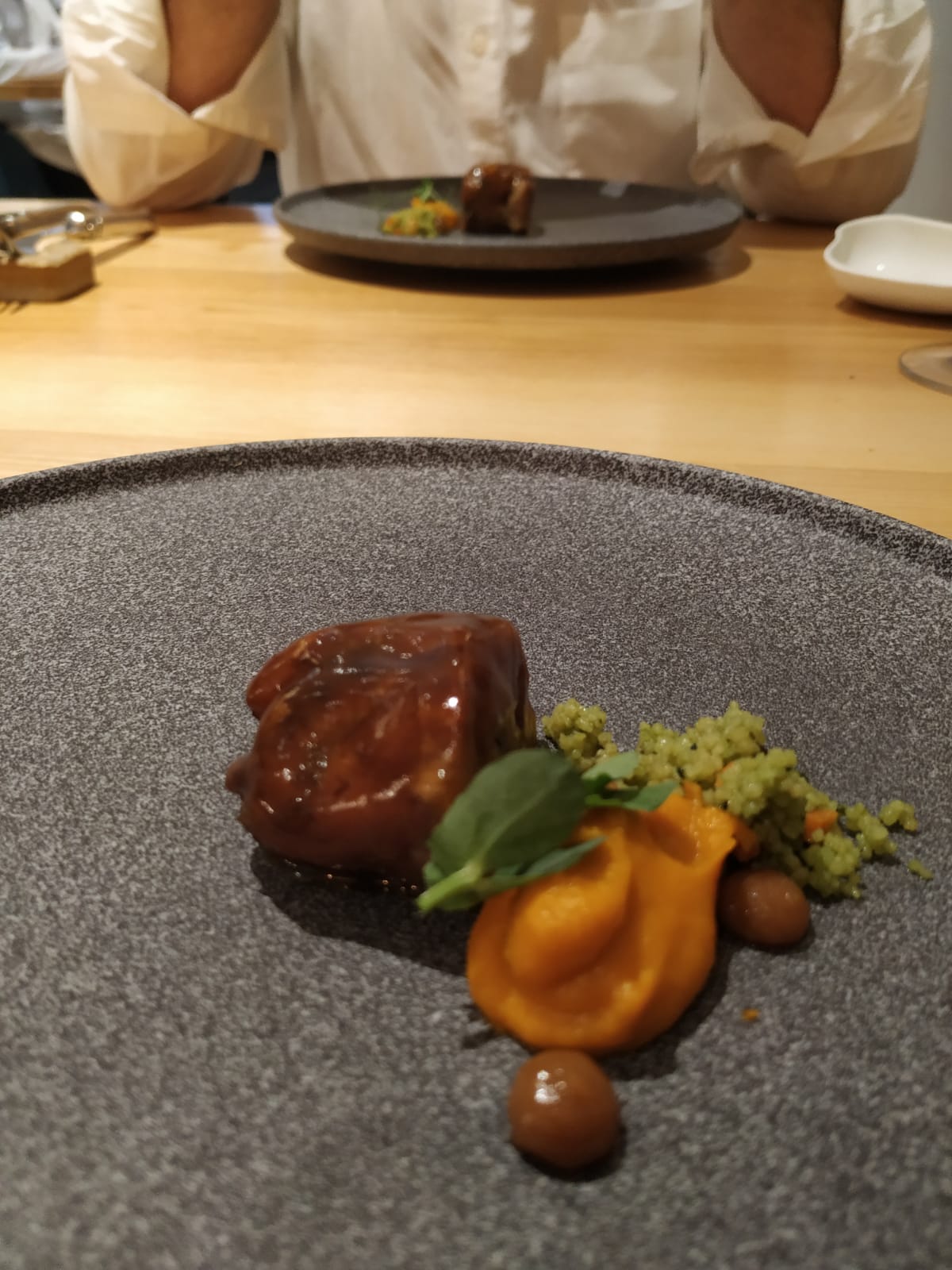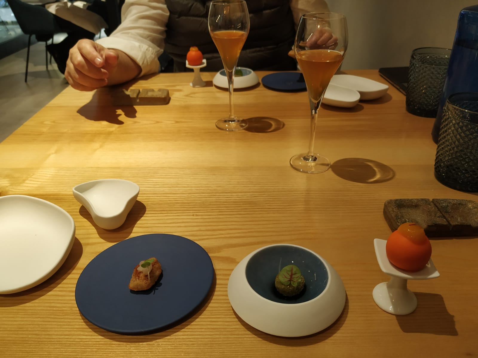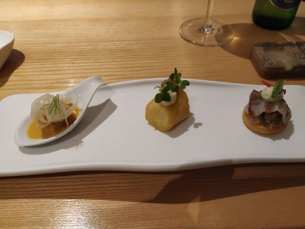 …que comienza con unos Snacks compuestos de Quesos de autor – romero y jengibre (toda una explosión de sabor), Salpicón de mújol y lechuga de mar, Gyoza “umami” de cordero segureño y Arepa de costilla de chato y menta. Un inicio que prometía…
