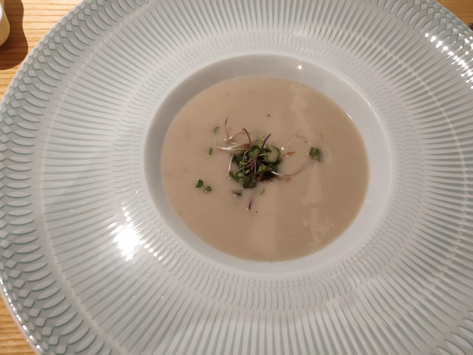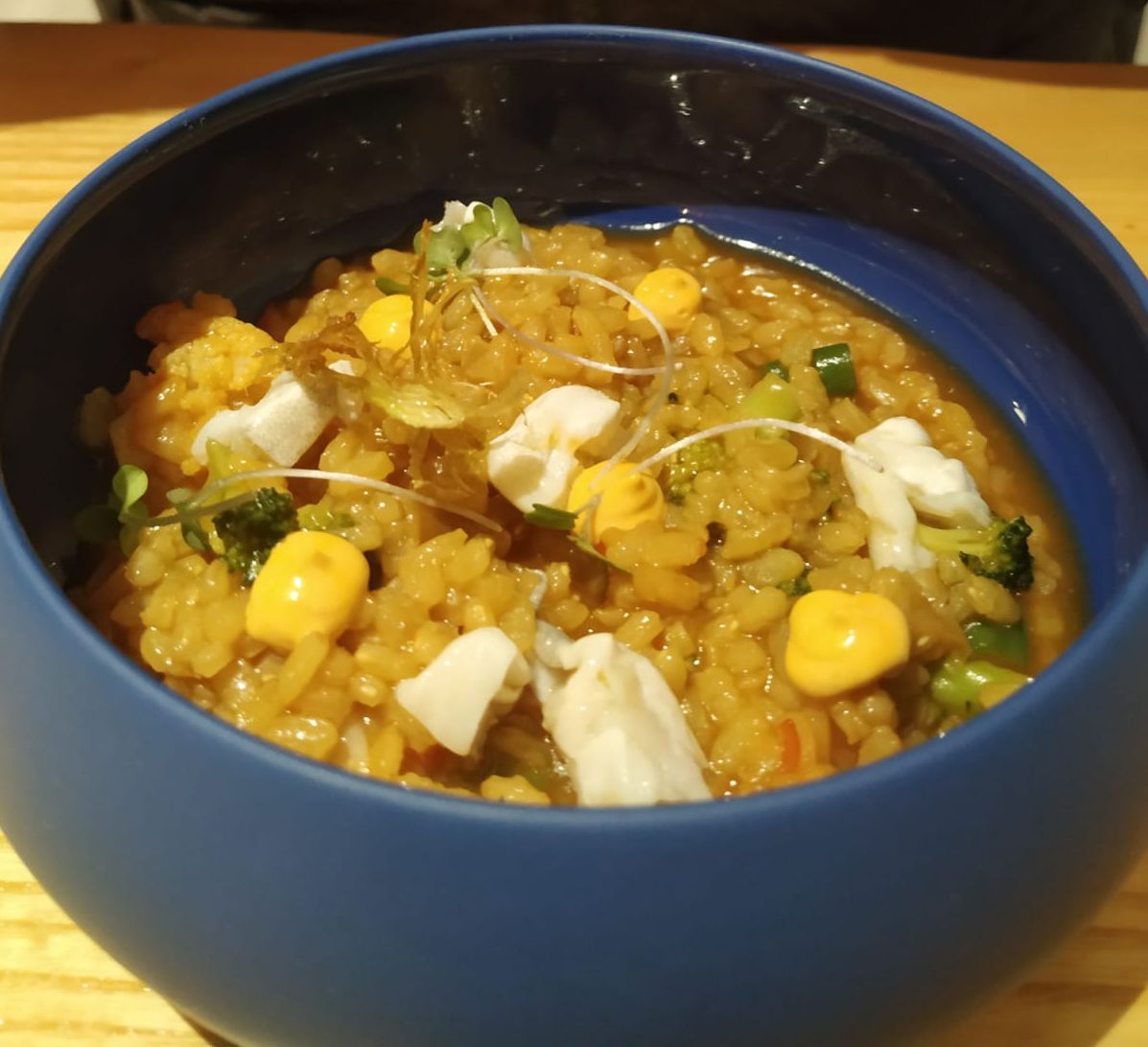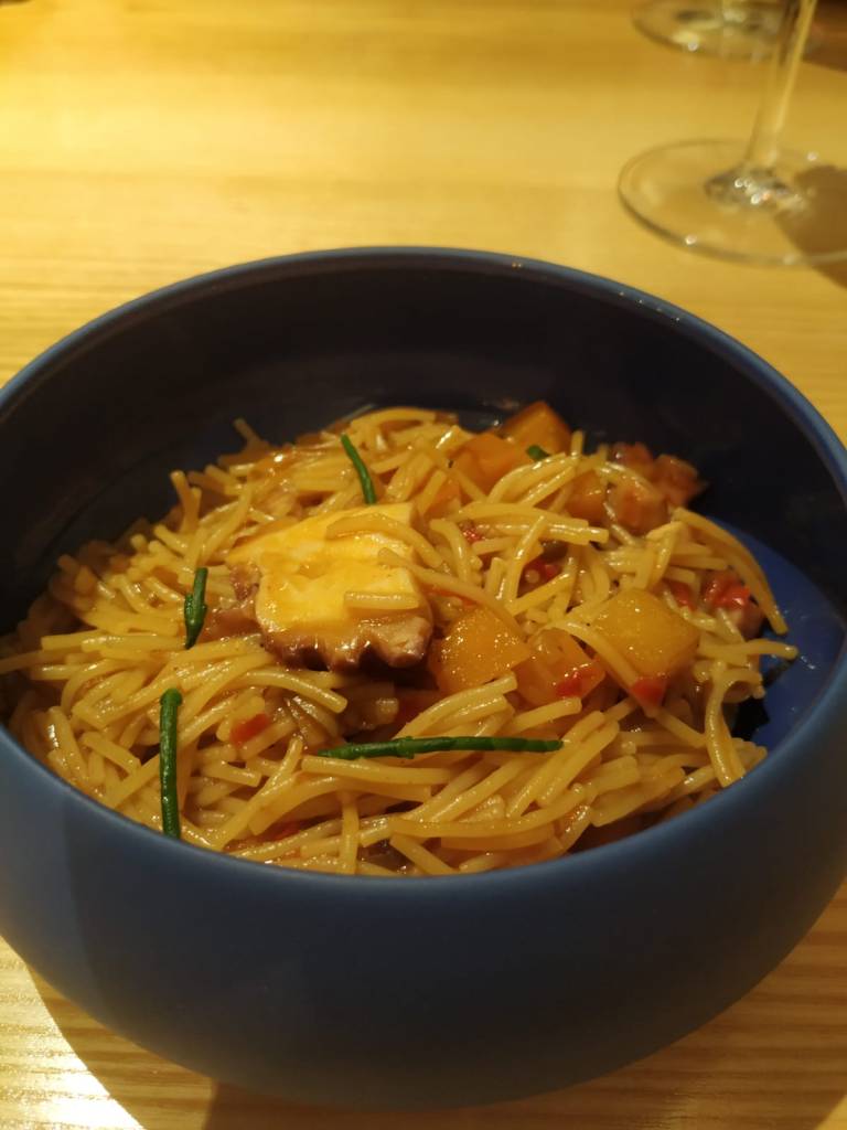 El menú continúa con cinco entrantes, ricos en sabores. Comienzan con la Ensalada murciana de anguila ahumada y albahaca, a la que sigue una Zamburiña curada en kombu, bearnesa y pan de cuquillo, una espectacular Crema anisada de castañas, ragout de setas y trufa negra, un potente Arroz meloso de Calasparra, verduras y kokotxa de bacalao y, para finalizar, un Suquet-wonton de bogavante y calabaza.