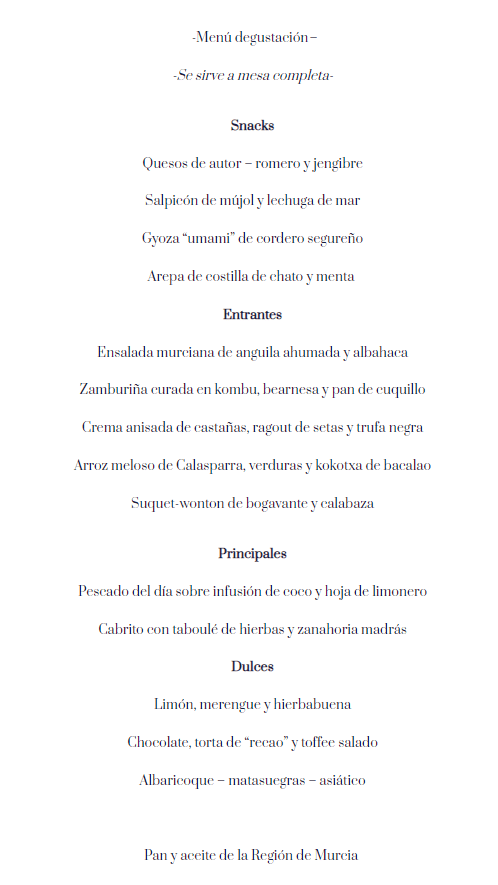 Un Menú degustación adaptado totalmente a algún alérgeno sin apartarse en excesivo de la idea original. Sin duda, una comida maravillosa, digna de un restaurante Estrella Michelin, tanto por la cocina de Juan Guillamón, exquisita, basada en producto de la región de Murcia, una auténtica explosión de sabores muy equilibrados, como por el servicio de mesa, y, fundamentalmente, y que no se enoje nuestro brillante chef, por la maravillosa compañía de May. Eso sí que es un auténtico lujo.