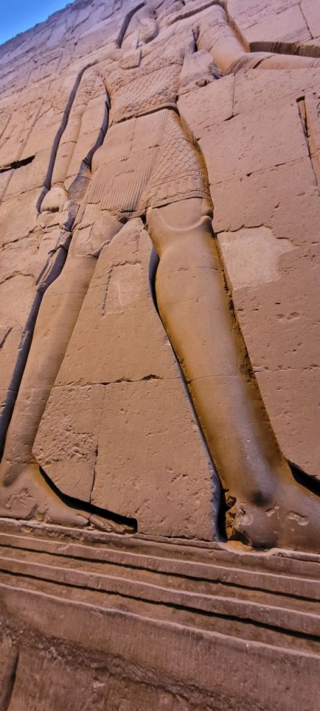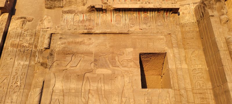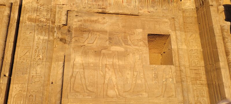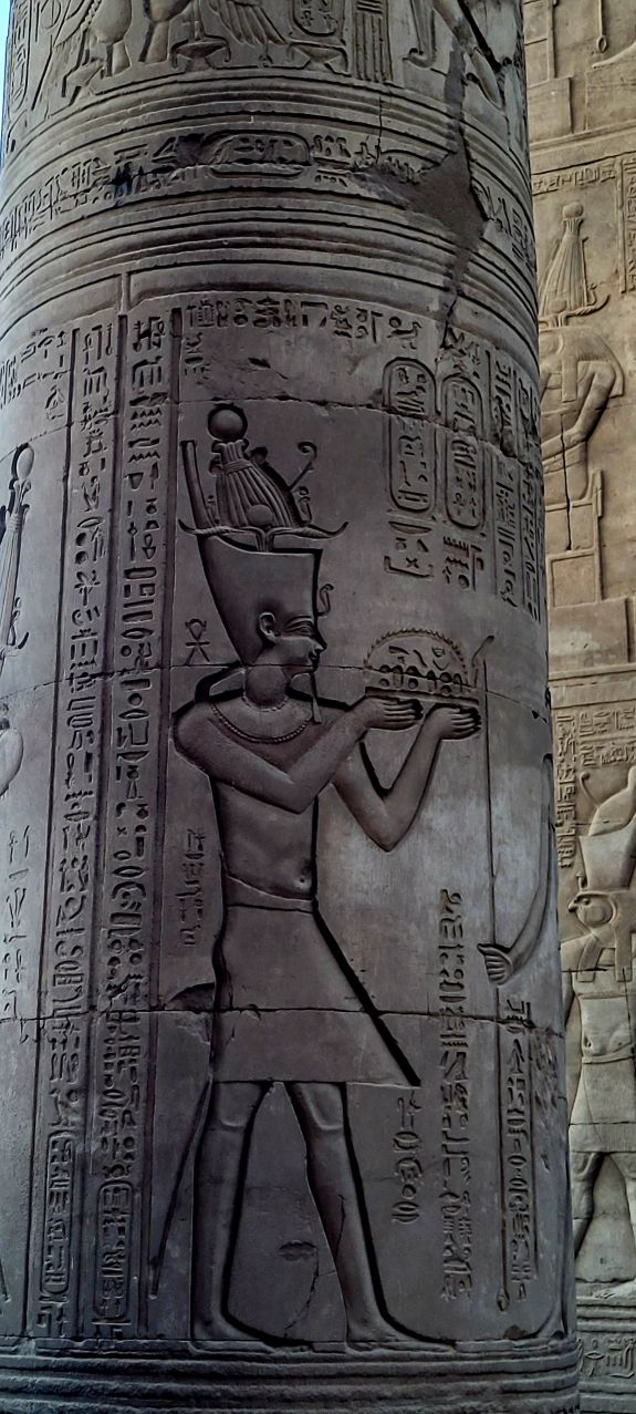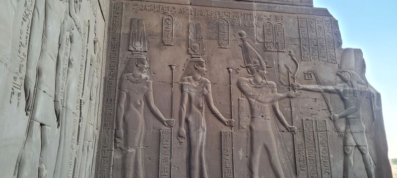 Del gran pilono de acceso al templo queda solo la parte de la derecha, donde todavía es visible un relieve del emperador Domiciano rindiendo culto a la triada de Sobek, Hathor y Khonsu.