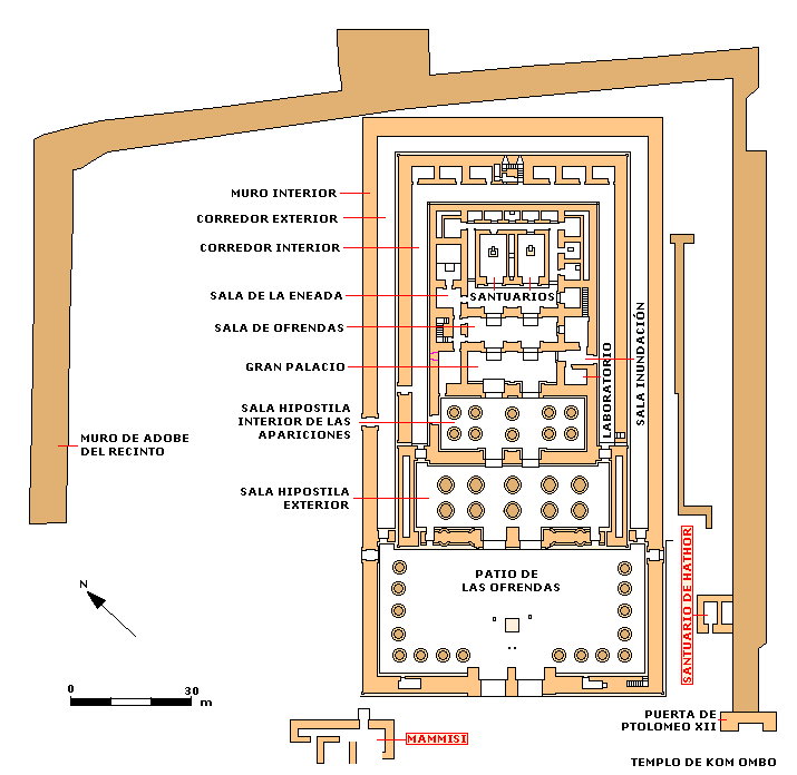 Un doble pasillo rodea todo el templo. En el interior, detrás de los santuarios, se abren siete pequeñas capillas donde encontramos un relieve con toda una serie de instrumentos quirúrgicos (bisturíes, tijeras, tenazas, pinzas,…), hecho este que confirme el alto nivel de perfeccionamiento que los egipcios habían alcanzado en el campo de la medicina.