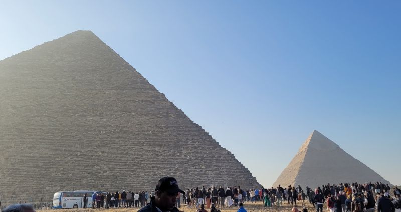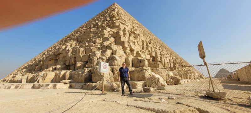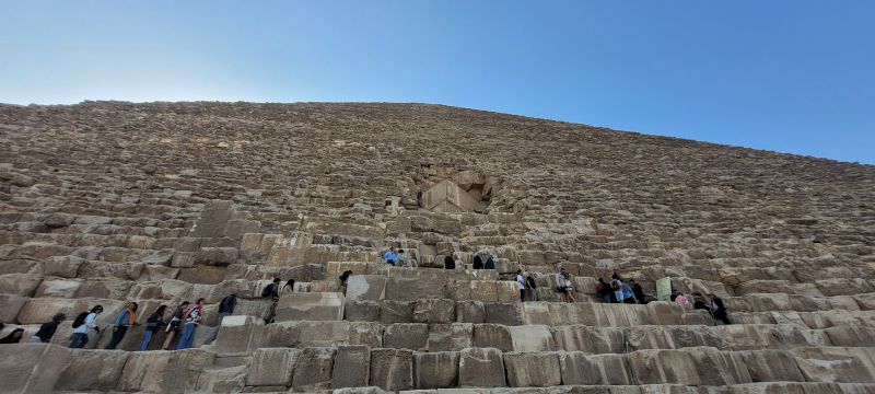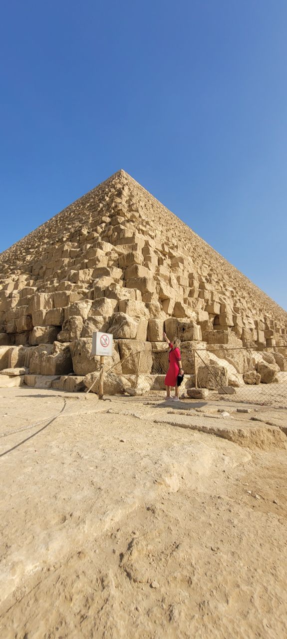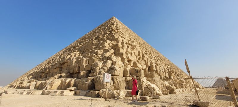 Tras la visita al mirador volvimos a la explanada situada entre las otras dos pirámides del complejo. Nos encontrábamos ante la Gran Pirámide de Guiza, la más alta con sus 146,61 metros, equiparable a un edificio de, aproximadamente, cuarenta pisos. Su base tiene 230 metros de ancho.
