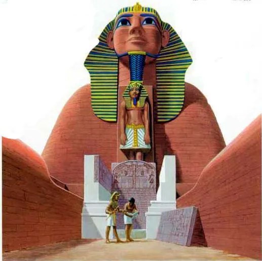 En épocas antiguas estaba pintada en vivos colores: rojo el cuerpo y la cara, y el nemes que cubría la cabeza con rayas amarillas y azules.