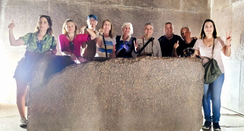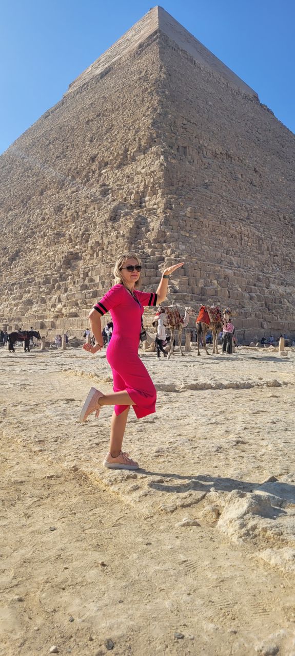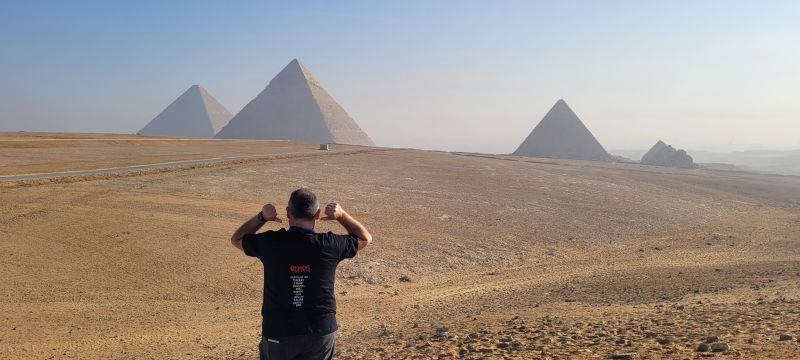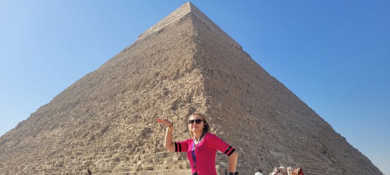 Su altura total original es de 143,5 metros, sin embargo, su altura actual es de 136,4 metros. Es la primera gran pirámide que se construyó basándose en el triángulo sagrado egipcio de proporciones 3-4-5. Tras pasear la camiseta de los «Fisicantes 2022-23» por todo Egipto, este era el marco incomparable para inmortalizarla.
