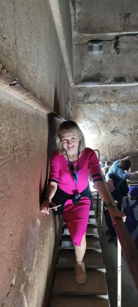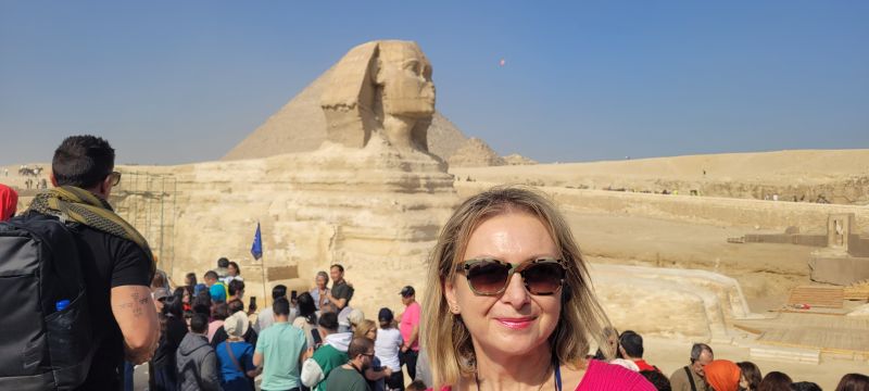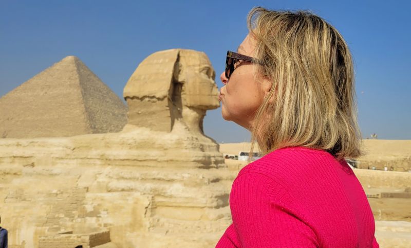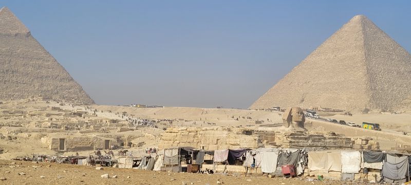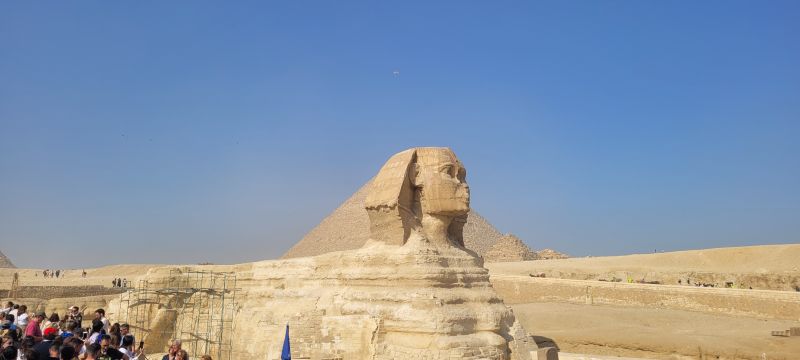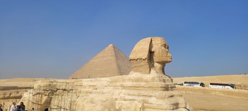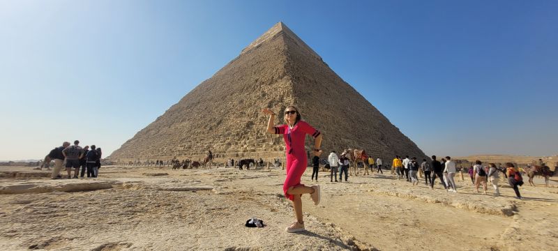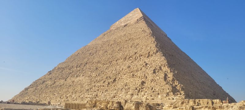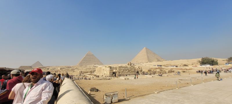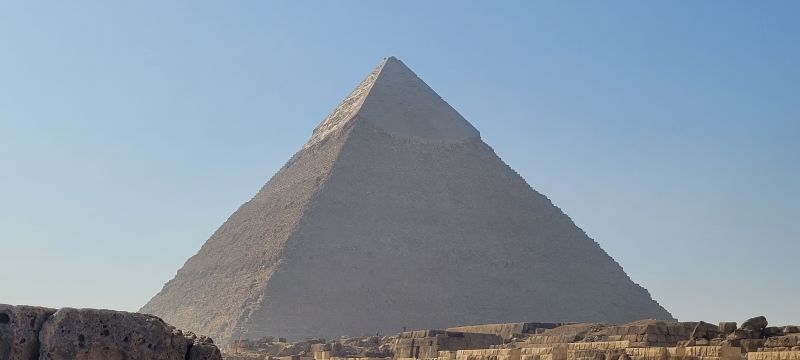 A la salida de la pirámide de Keops nos diriginos a la de Kefrén, que tiene diez metros menos de altura, aunque visualmente parece más alta debido a que está construida en una pequeña elevación del terreno y presenta un ángulo más inclinado en sus caras (el ángulo sagrado egipcio), utilizado en algunas pirámides posteriores.