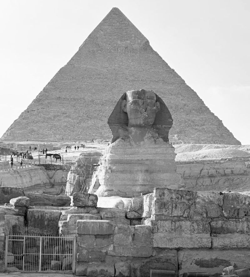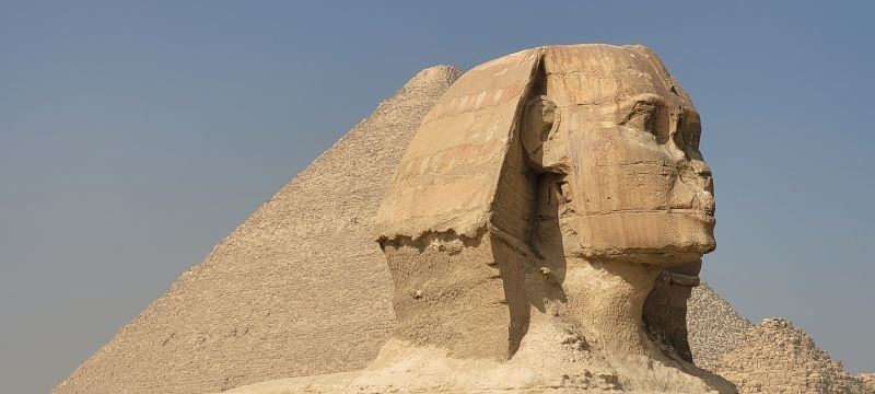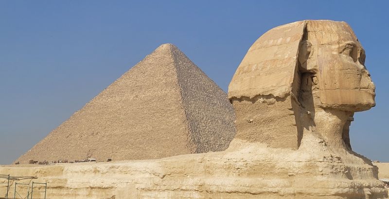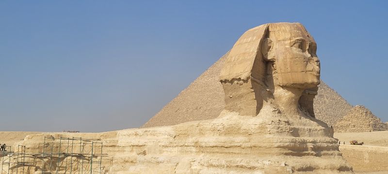 La Gran Esfinge se realizó esculpiendo un montículo de roca caliza situado en la meseta de Guiza. Tiene una altura de unos veinte metros, aproximadamente, y unos 70 de longitud. La cabeza podría representar al faraón Kefrén, teniendo el cuerpo la forma de un león.
