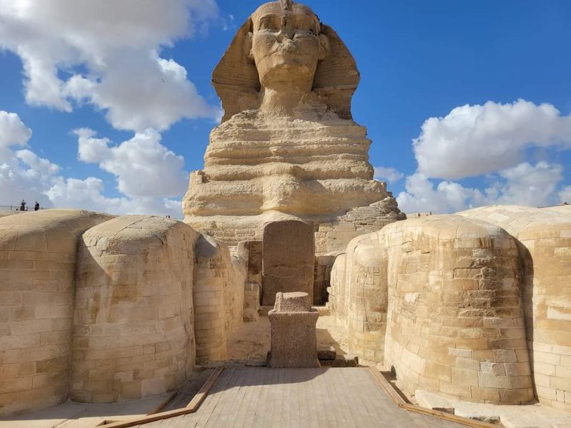 Se construyó un templo frente a la estatua, datado en el Imperio Antiguo, y otro más al norte, junto a la esfinge, durante el Imperio Nuevo, como lugares de ofrendas a la “imagen viviente”.