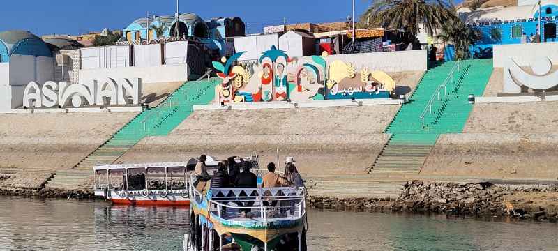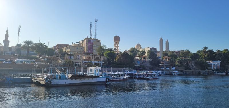 A la vuelta cambiamos de itinerario, pues la motora, en vez de dirigirse a la motonave, ponía rumbo a un embarcadero cercano a la catedral de Aswan, donde nos esperaba el autobús que nos llevaría al aeropuerto de la ciudad.