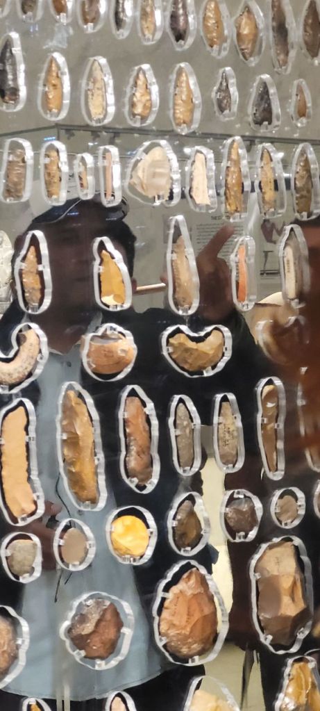 Comenzamos con un espacio que nos muestra el Periodo predinástico de Egipto anterior a la unificación del valle del Nilo. Hablamos de la época prehistórica del Calcolítico o Edad del cobre que dieron paso al Egipto faraónico y que contiene vitrinas con bifaces y otras herramientas.