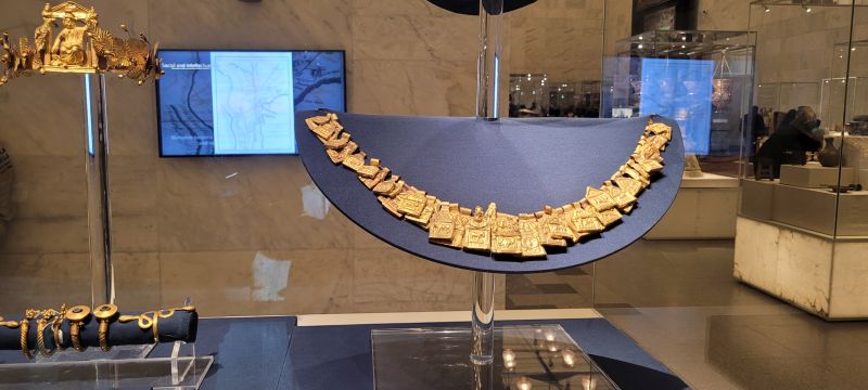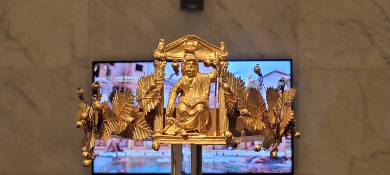 Incluye una corona decorada con la forma del dios Serapis, dos brazaletes y dos collares de oro de 187 planchas de oro fino. Período romano, cuadrícula del siglo 2 d.C.