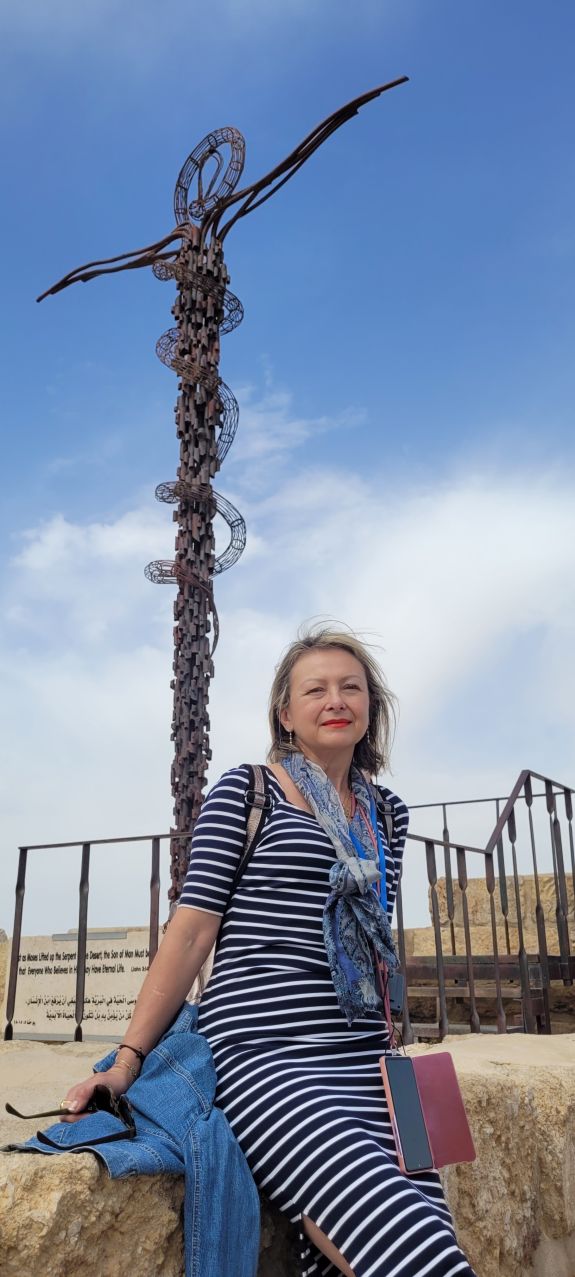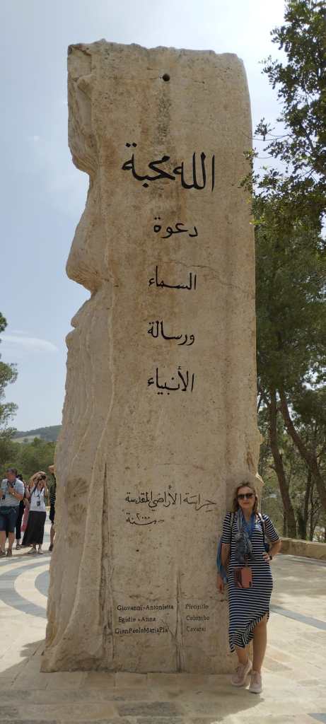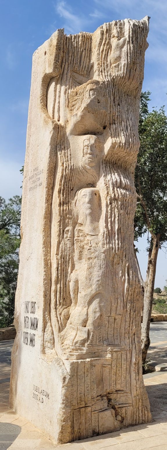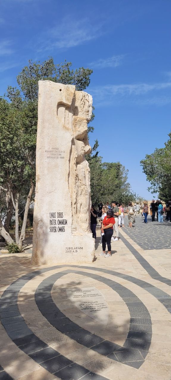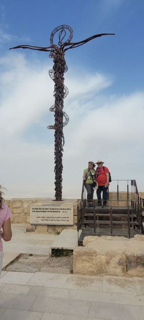 En la terraza panorámica que hay frente a la iglesia, donde pudimos admirar el espléndido escenario natural de la llanura de Moab y las colinas de Palestina, se alza otro monumento en bronce, realizado por Gian Paolo Fantoni, que representa una serpiente enroscada en un bastón.