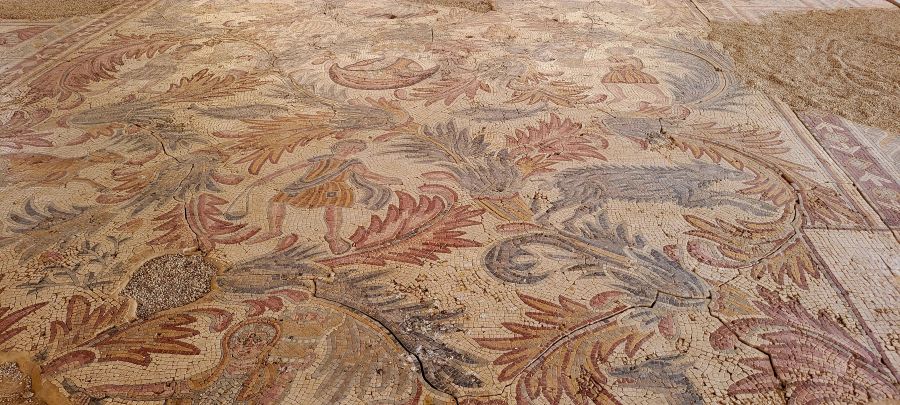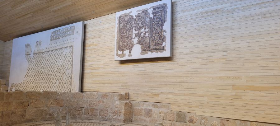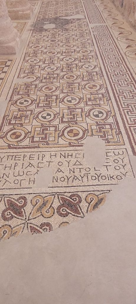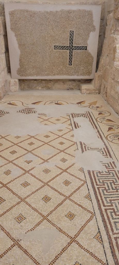 El maravilloso mosaico del pavimento, descubierto en 1976, se preservó gracias a que el suelo del diacónico, donde se hallaba el mosaico, se elevó un metro casi para ponerlo al mismo nivel que el de la basílica. Para ello fue necesario cubrir el mosaico, lo que evitó su destrucción. Durante estas obras, también se construyó un nuevo baptisterio en el lado sur de la iglesia, en sustitución de la pila bautismal originaria.