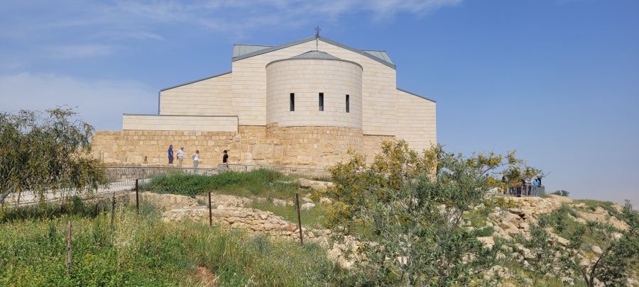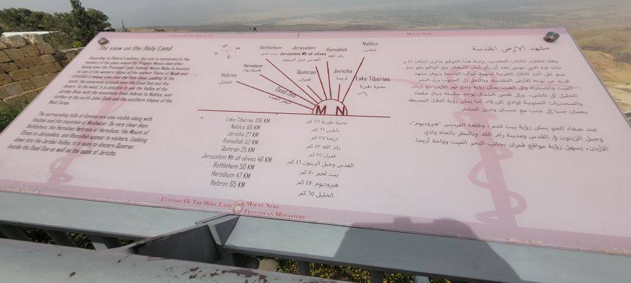 Fue aquí donde Moisés se detuvo a contemplar la Tierra Prometida, y donde los franciscanos de la Custodia de la Tierra Santa edificaron su memorial sobre las ruinas de un monasterio que, a su vez, se alzaba donde se asegura que estuvo la tumba de Moisés. Según la Biblia, Yahvé ordenó a Moisés subir al Monte Nebo para contemplar la tierra de Canaán antes de morir.