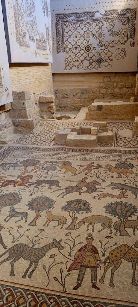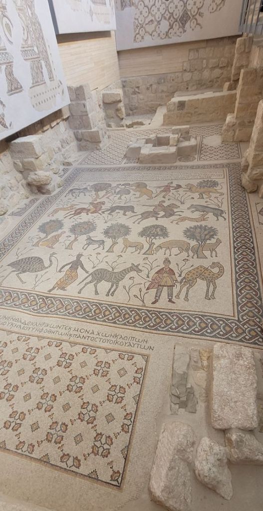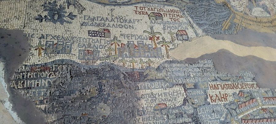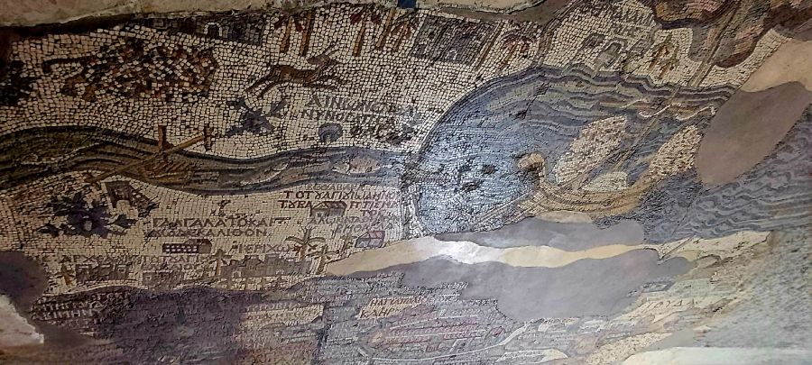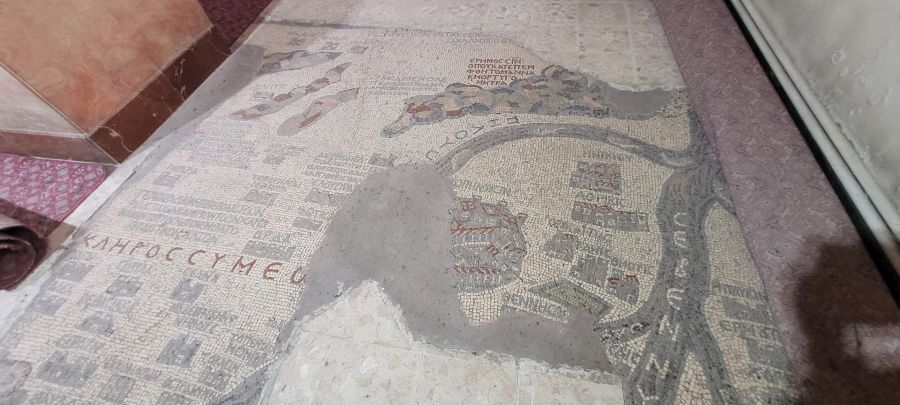 Este mapa es un mosaico del año 560 que constituye un excepcional documento de geografía bíblica, al abarcar desde la zona de Tiro y Sidón hasta el delta del Nilo, y del mar al desierto. Originariamente medía 17,5 x 10 m y está compuesto por dos millones de teselas. El que contemplamos en la actualidad presenta una superficie más reducida.
