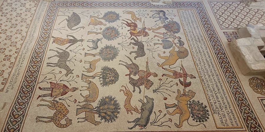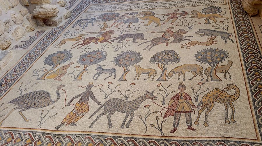 En la cuarta, dos jóvenes, uno negro y otro blando, el primero con un avestruz y el segundo vestido con un manto y un gorro frigio, sujetan por el ronzal a un dromedario y a una cebra. Se puede leer los nombres del obispo de Madaba y de sus creadores en la inscripción superior del mosaico.