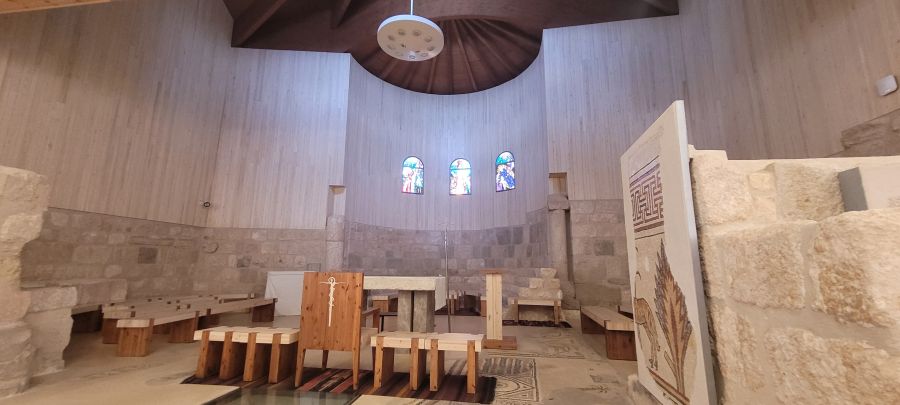 Ya en la iglesia, a la derecha de la entrada, se puede ver la capilla de la Virgen María, añadida en el siglo VI, aprovechando un ábside anterior. Junto a esta, en la siguiente capilla, se encuentra el nuevo baptisterio, de la época en que el santuario fue ampliado. En la pila bautismal se descubrieron dos inscripciones, una de las cuales aludía al lugar donde los novicios recibían la iluminación y que hoy acoge una hermosa cruz de vidrio policromado.