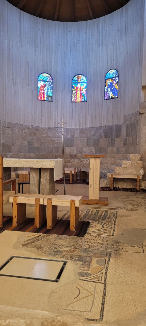 Inmediatamente antes, a la derecha del ábside de la nave central, una cruz realizada con teselas blancas y negras, al parecer señala el lugar donde estuvo ubicada la tumba de Moisés (el Memorial).