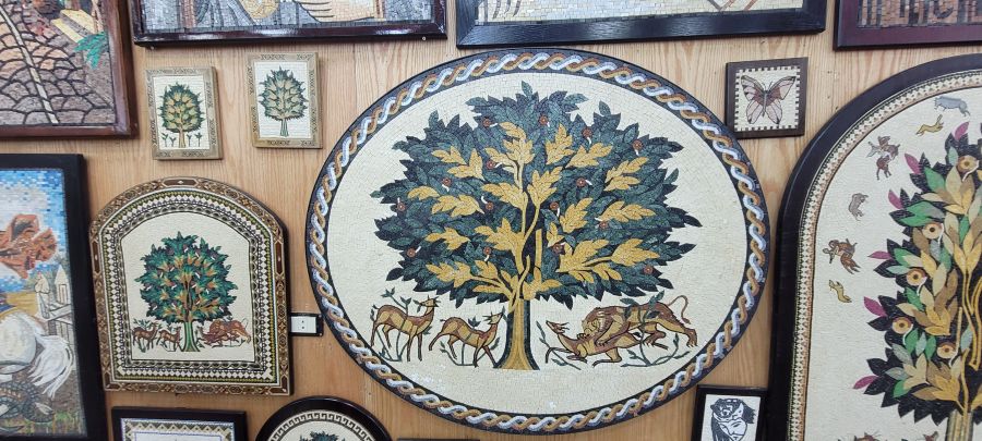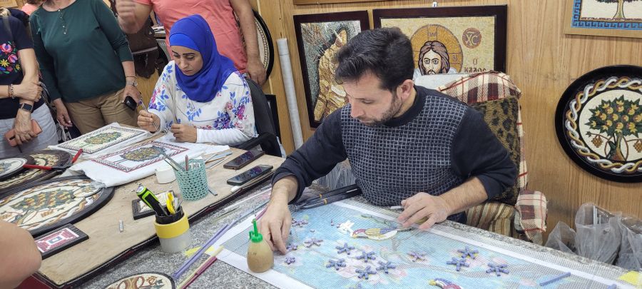 Tras la visita nos dirigimos a Madaba, pero antes contemplamos el arte de la confección de mosaicos en una de las fábricas cercanas al Monte Nebo.