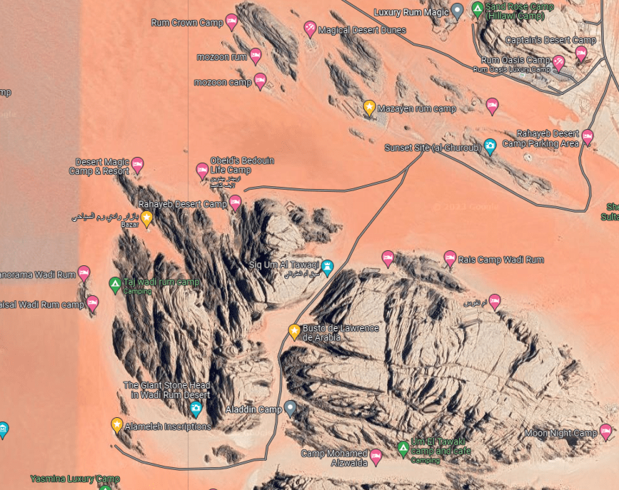 La zona está delimitada por dos macizos montañosos, el gebel Rum, de 1.754 metros (uno de los picos más altos de Jordania) y el gebel Umm Ishrin (1.753 metros), cuyo nombre significa “montaña de la madre de los veinte”.