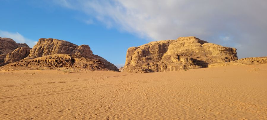La primera de ellas, en una duna de arena roja. Los efectos de la intemperie, la erosión eólica y la desintegración de los bloques de arenisca derrumbados siguen produciendo la gran cantidad de arena que cubre los suelos de los wadis y que se monta a los acantilados como dunas trepadoras.