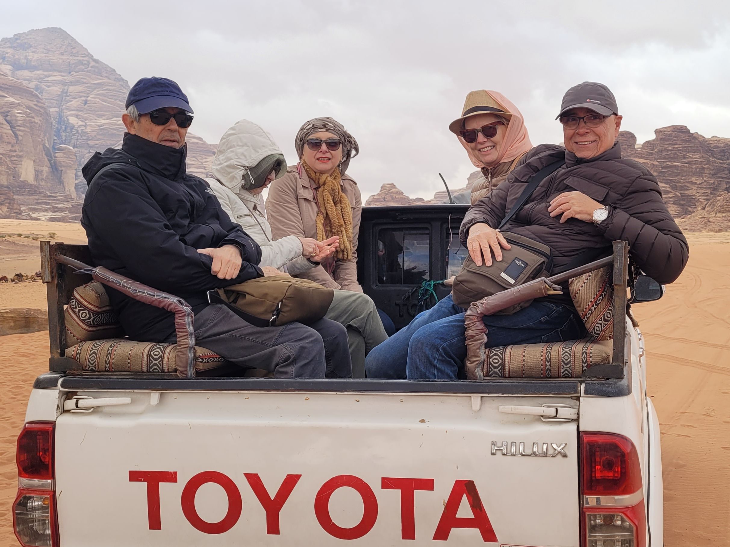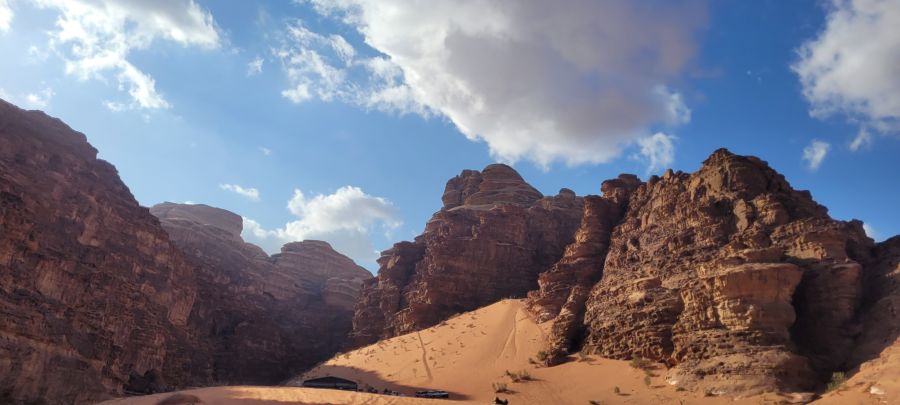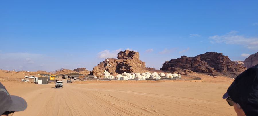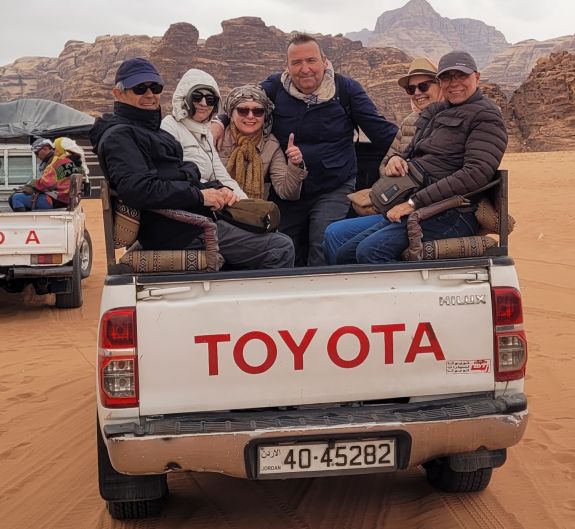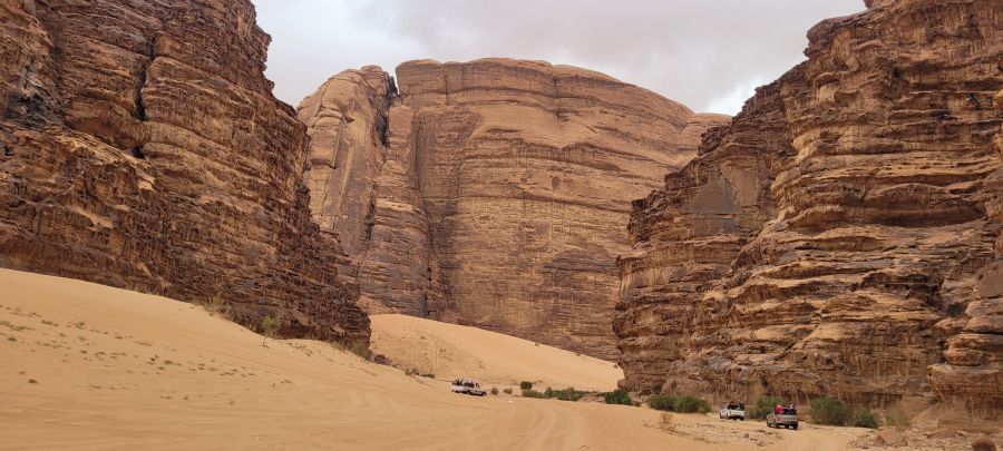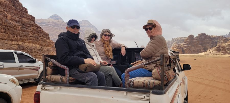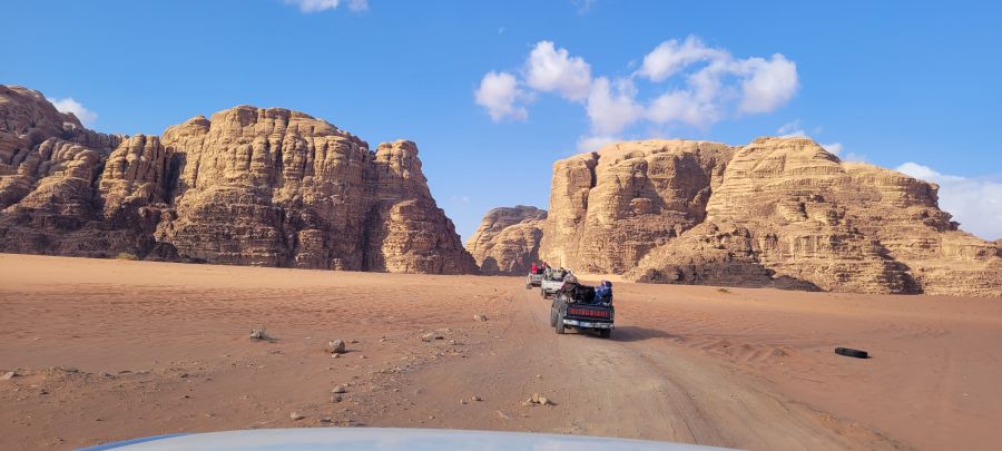 Como siempre, a la carrera, a desayunar y a meter el equipaje en el autobús. A renglón seguido, montamos en nuestro 4×4 para el recorrido (tour clásico) que nos tenían preparado por los imponentes paisajes de Wadi Rum, demasiado “turístico” y alejado de los monumentos geológicos más representativos de la zona (Little Bridge -Puente Rakhabat al-Wadak-, Mushroom Rock, arcos de Kharaz, Burdah Rock Bridge,…).