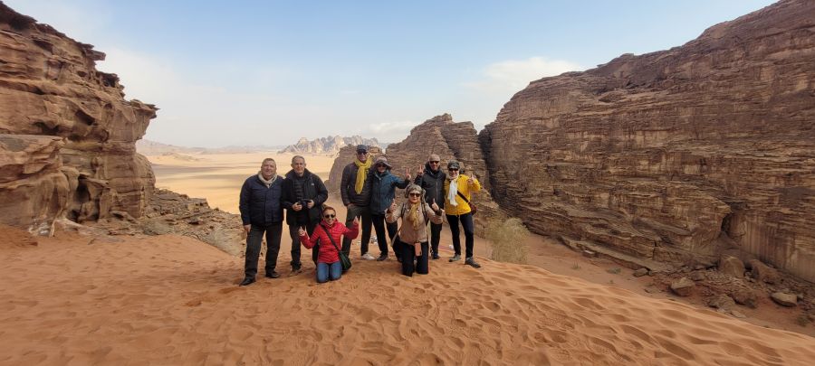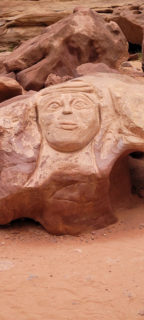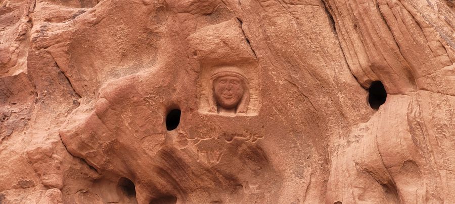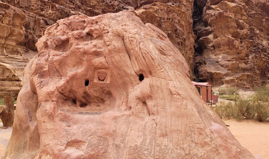 Siq Um Tawaqi constituyó la última parada. En la entrada al cañón encontramos una roca con tallas de la cabeza de T.E. Lawrence y sus compañeros. Enfrente, una espectacular duna y formaciones rocosas impresionantes.