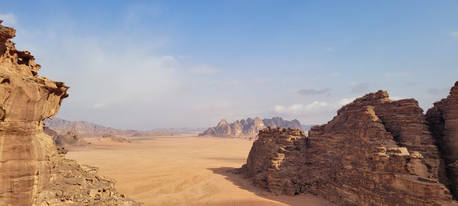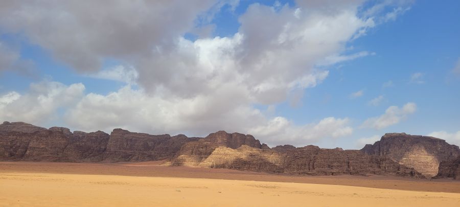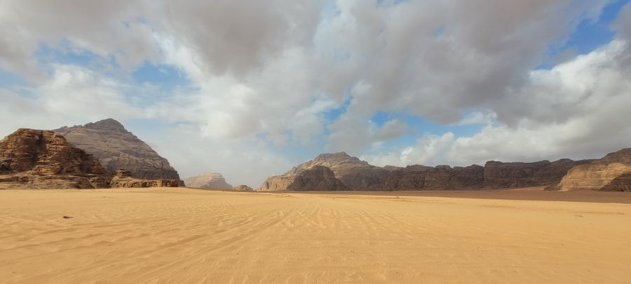 Wadi Rum es, en realidad, una meseta de casi 450 km2, con numerosos manantiales, caracterizada por sus arenas y las singulares formaciones rocosas que dan vida a escenarios irreales formados por torres, pináculos y agujas de arenisca, que dominan los lechos de antiguos ríos, ahora totalmente secos, y que le han valido el nombre de “valle de la Luna”.